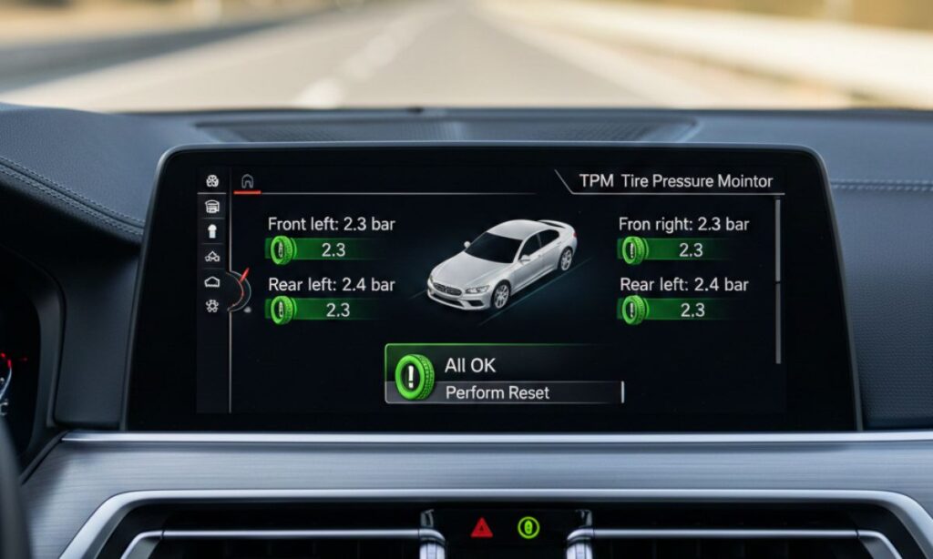 - W modelach z TPMS: Po regulacji zresetuj system w menu iDrive (Ustawienia > Pojazd > Ciśnienie opon > Reset).