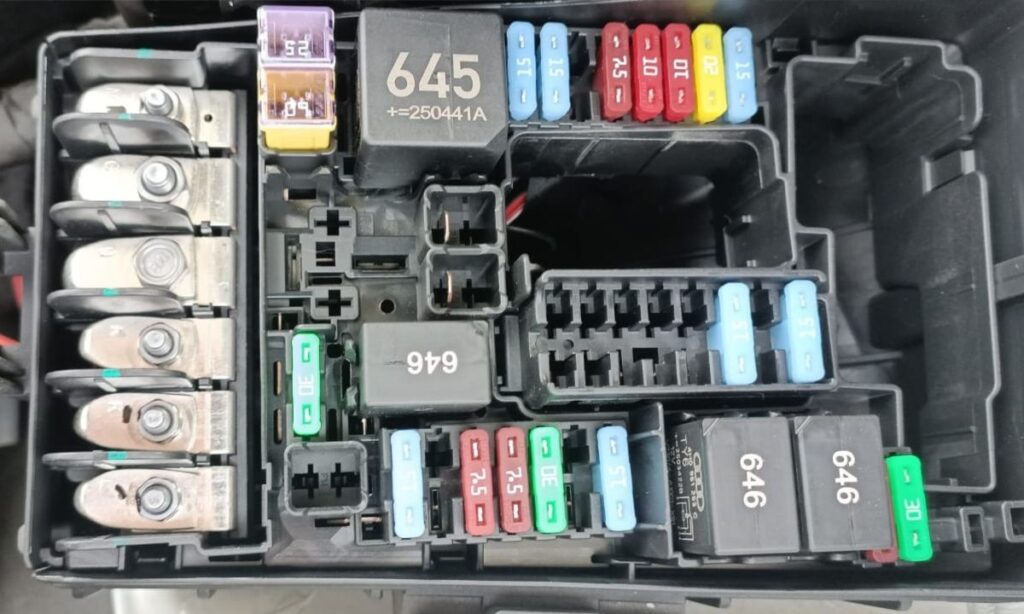- Skrzynka w komorze silnika – wysokoprądowa (Fuse holder A – SA): pod maską, lewa strona, blisko akumulatora 12 V (czarna pokrywa z zatrzaskami).
